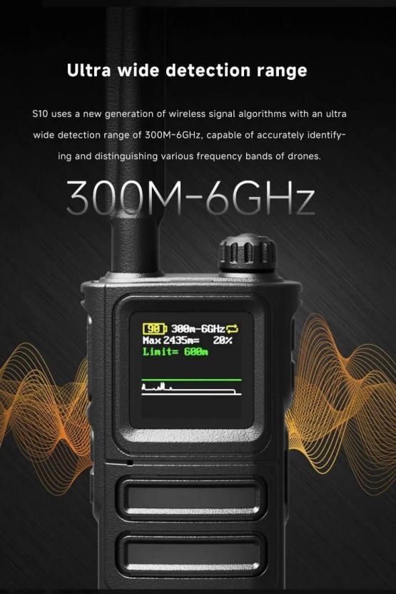 Детектор «SKYDROID S-10 / «СОКОЛ 10» – использует сверхширокий диапазон от 300МГц до 6.000MHz. «СОКОЛ 10» – это мобильное средство детекции беспилотных летательных аппаратов, он позволяет обнаруживать и идентифицировать самые популярные марки БПЛА, в том числе DJI, Autel и FPV-дроны на расстоянии до 1 км.